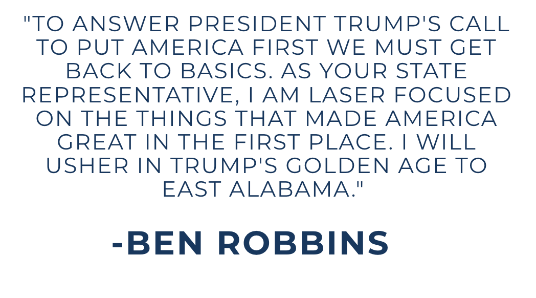 Ben Robbins will keep working to advance the America First agenda in the State House. Ben will not just talk the talk – but he will walk the walk to win for East Alabama. There is nothing more important than building the world we will hand to our children.